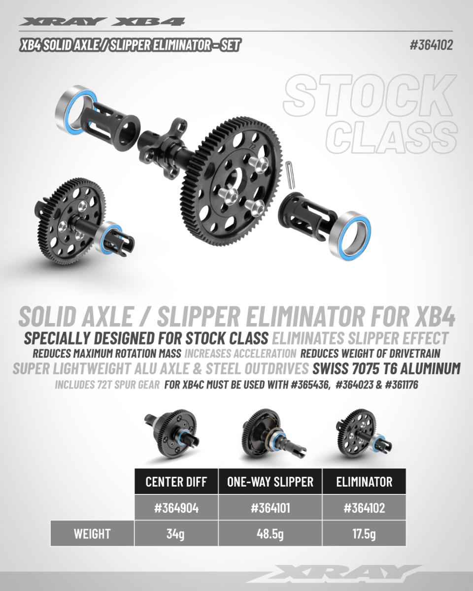 L'essieurigide XB4 avec anti-dribble est idéal pour les courses de catégoriestandard, car il réduit la masse de rotation maximale et éliminel'effet de glissement. Il contribue à augmenter l'accélération età alléger la transmission.